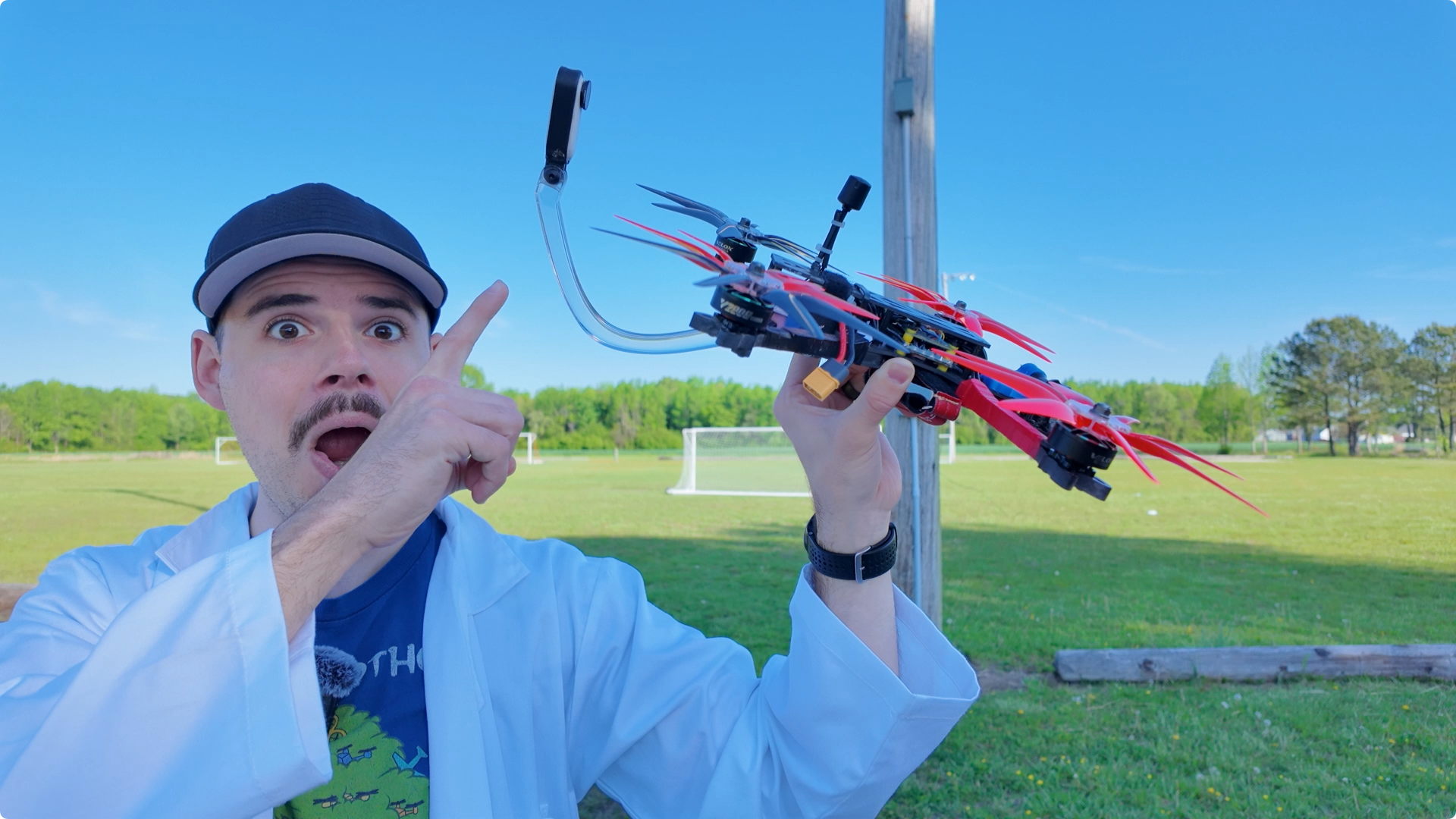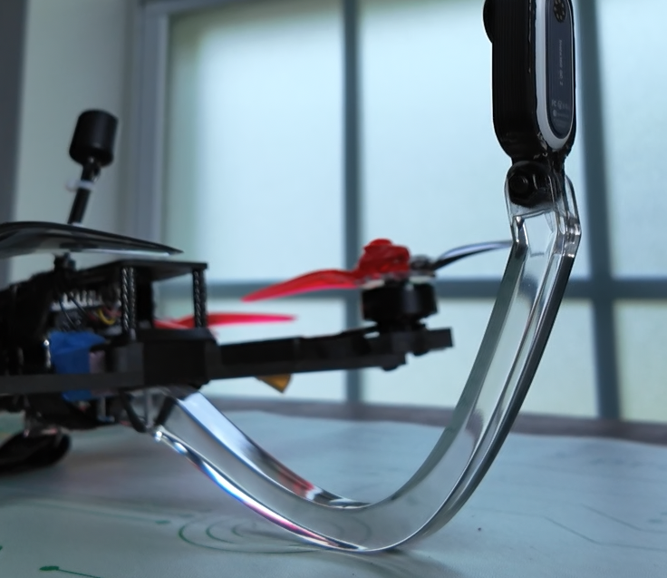 This model is a camera mount arm that is designed to position a small action camera behind an FPV drone and remain out of sight (or at least not be very noticeable) to give a third-person-view perspective during flight.
